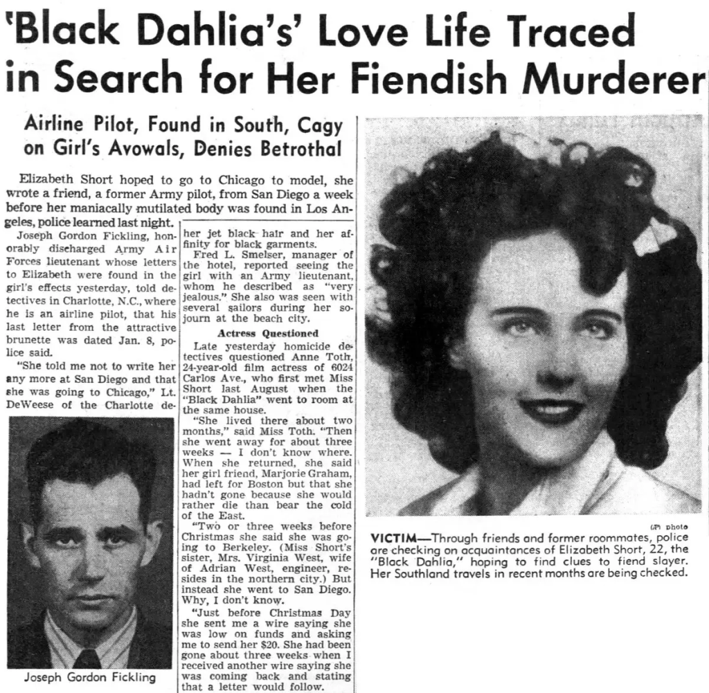 Nạn nhân là Elizabeth Short, sinh năm 1924, được biết đến với ngoại hình nổi bật và ước mơ theo đuổi sự nghiệp diễn xuất tại Hollywood. Sáng 15.1.1947, một phụ nữ đang dắt con đi dạo tại khu vực Leimert Park, Los Angeles, phát hiện một thi thể nữ bị phân thành hai phần đặt trên bãi đất trống. Thi thể được xác định là Elizabeth Short.