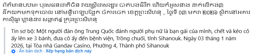 Theo thông tin ban đầu, nạn nhân được cho là đã xảy ra xô x.a.t với một người đàn ông mang quốc tịch Trung Quốc tại khu vực casino. Sau sự việc, nạn nhân được đưa đến trước cổng một bệnh viện địa phương bằng xe ba bánh trong tình trạng nguy kịch. Khi người thân có mặt, nạn nhân đã không còn dấu hiệu sự sống.